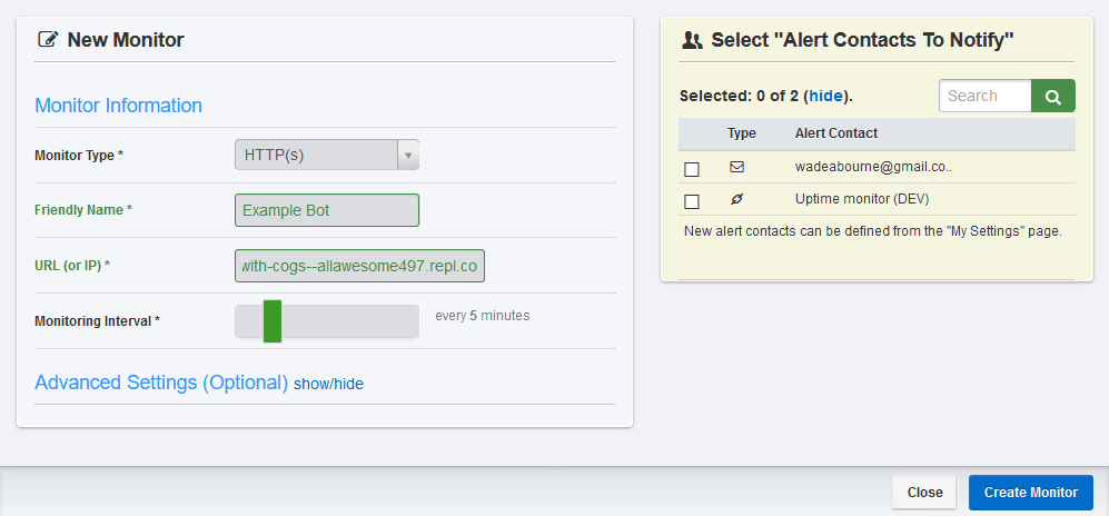 - Select any alert contacts you want, then click "Create Monitor"